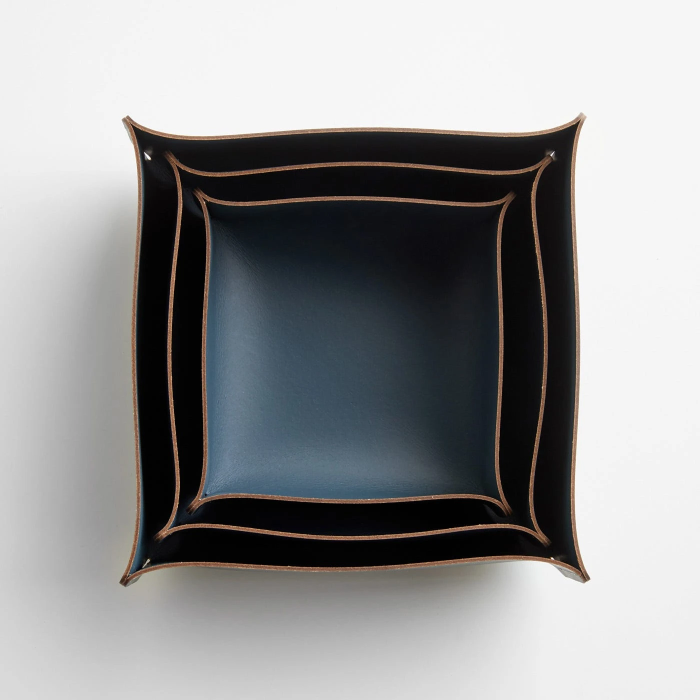 Crafted in Spain using 100% recycled leather, this set of Square Deep Teal Leather Storage Bins serves as a sustainable storage solution. Discarded pieces from the leather industry are cleaned and then bonded with natural fibers and latex to create an environmentally friendly material. The flexible leather is shaped into squares, with the exposed stitching at the corners adding a decorative detail. These leather bins in varying sizes fit neatly on shelves or entryway tables, or they can be nestled inside cabinets and drawers. With a deep blue-green color, the bins make for eye-catching decorative accents in the home.