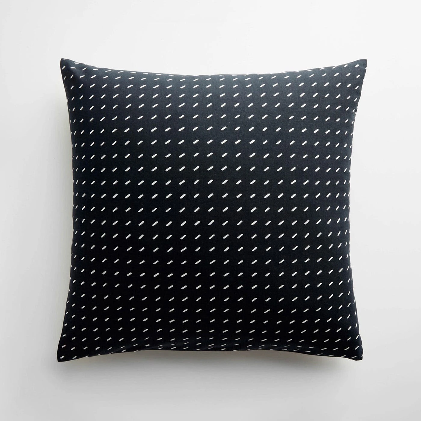 Discover a fan-favorite Unison fabric print with the Stitch Black Throw Pillow Cover. Originally designed in 2010, the idea behind the Stitch pattern was to create an all-over solid print with a subtle texture. Small, hand-drawn dash marks add a sense of movement, making this large statement pillow cover instantly eye-catching. The durable 100% cotton sailcloth fabric is hand screen-printed in Rhode Island at a family-owned textile mill, which has been in operation for over 80 years. The classic look and feel of the Stitch pattern in a bold black coordinates nicely with our other in-house prints: Sailor and Tiles.