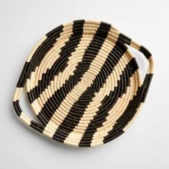This fair trade basket offers an inspired combination of practicality and beauty. Handcrafted in Uganda with raffia, banana fibers and organic dyes, each tray is made using traditional weaving techniques passed down through generations. The natural materials bring warmth, texture and character to each piece, and built-in handles on either side facilitate easy carrying. Bold black stripes add distinctive detail and emphasize the tray’s one-of-a-kind, handmade quality. Thanks to a hanging loop on the back, it can be displayed as art when not in use as a table centerpiece or serving tray.