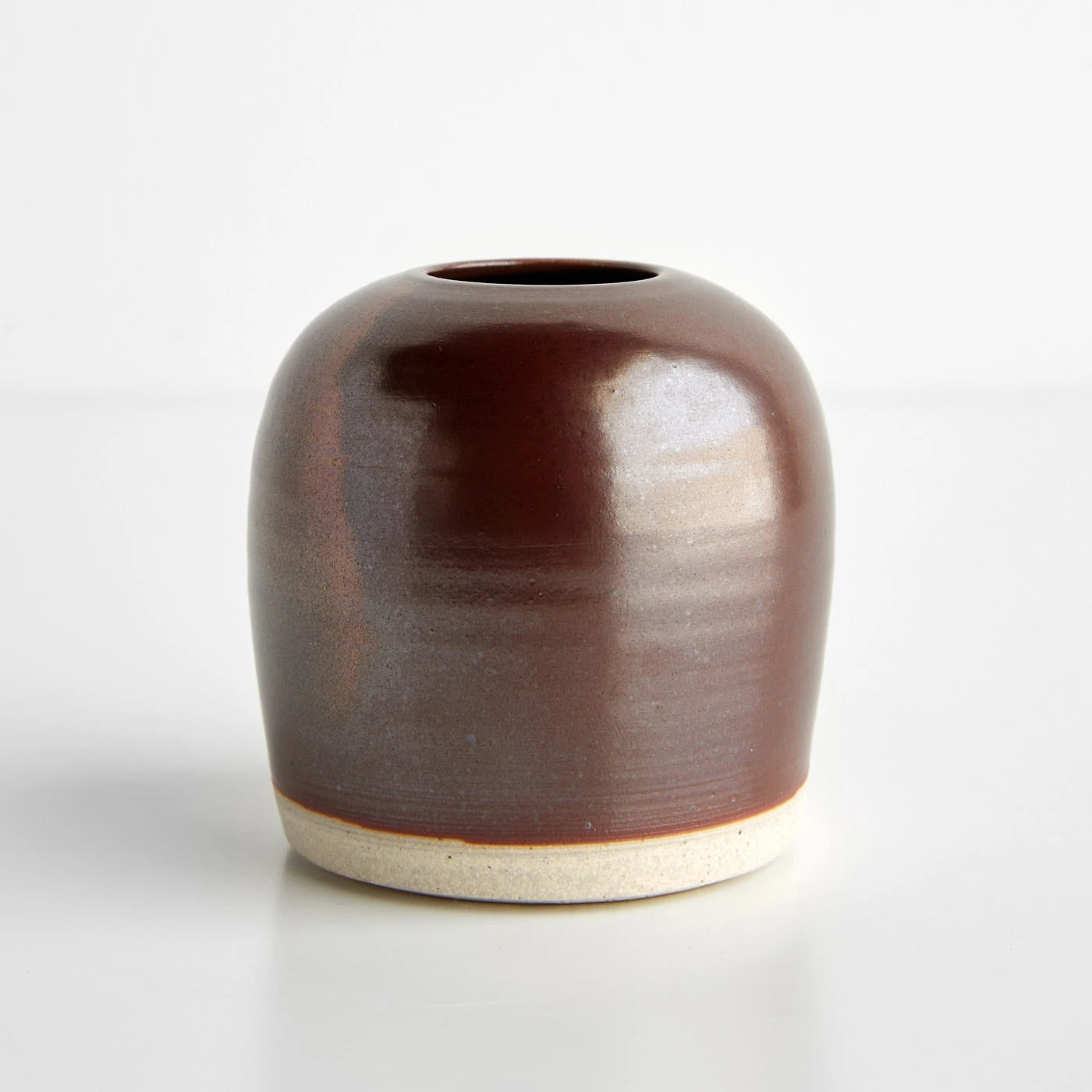 Handcrafted beauty is matched up with nature-inspired color in the Thrown Chocolate Bud Vase. This delightful accent may be small in size, but it adds an eye-catching, artistic element to a table, shelf or mantel. Crafted in a small Southern California studio run by Japanese artist Nobuhito Nishigawara, each piece features a rounded top and straight sides with a slight taper to the flat bottom. A slightly iridescent brown glaze covers most of the piece, leaving an exposed portion of raw natural matte clay. This one-of-a-kind handmade vase is ideal for everyday use and makes for a unique, beautiful gift.