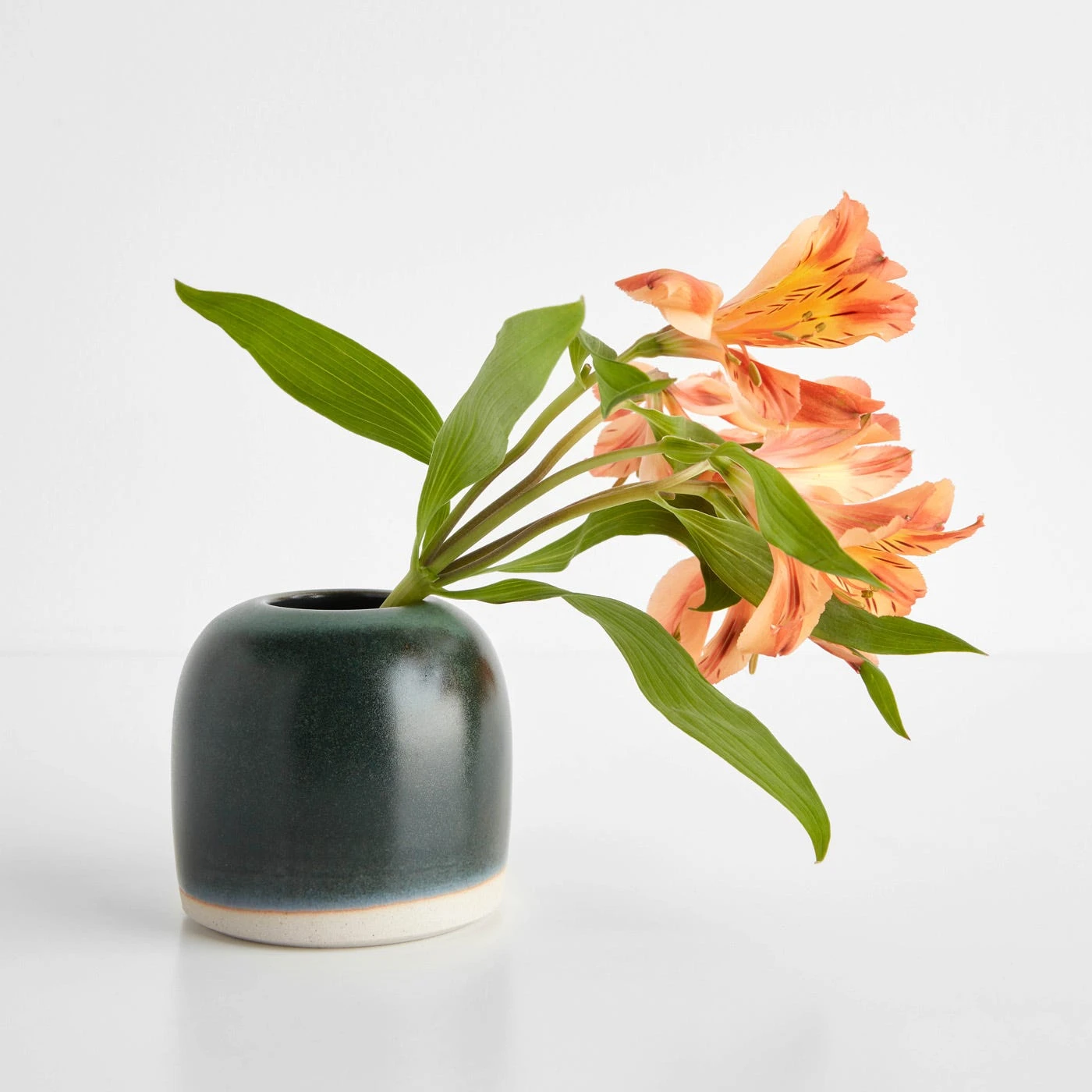 Handcrafted beauty is matched up with nature-inspired color in the Thrown Green Bud Vase. This delightful table accent may be small in size, but it adds an eye-catching, artistic element to a table, shelf or mantel. Crafted in a small Southern California studio run by Japanese artist Nobuhito Nishigawara, each piece features a rounded top and straight sides with a slight taper to the flat bottom. A deep forest green glaze covers most of the piece, leaving an exposed portion of raw natural matte clay. This one-of-a-kind handmade vase is ideal for everyday use and makes for a unique, beautiful gift.