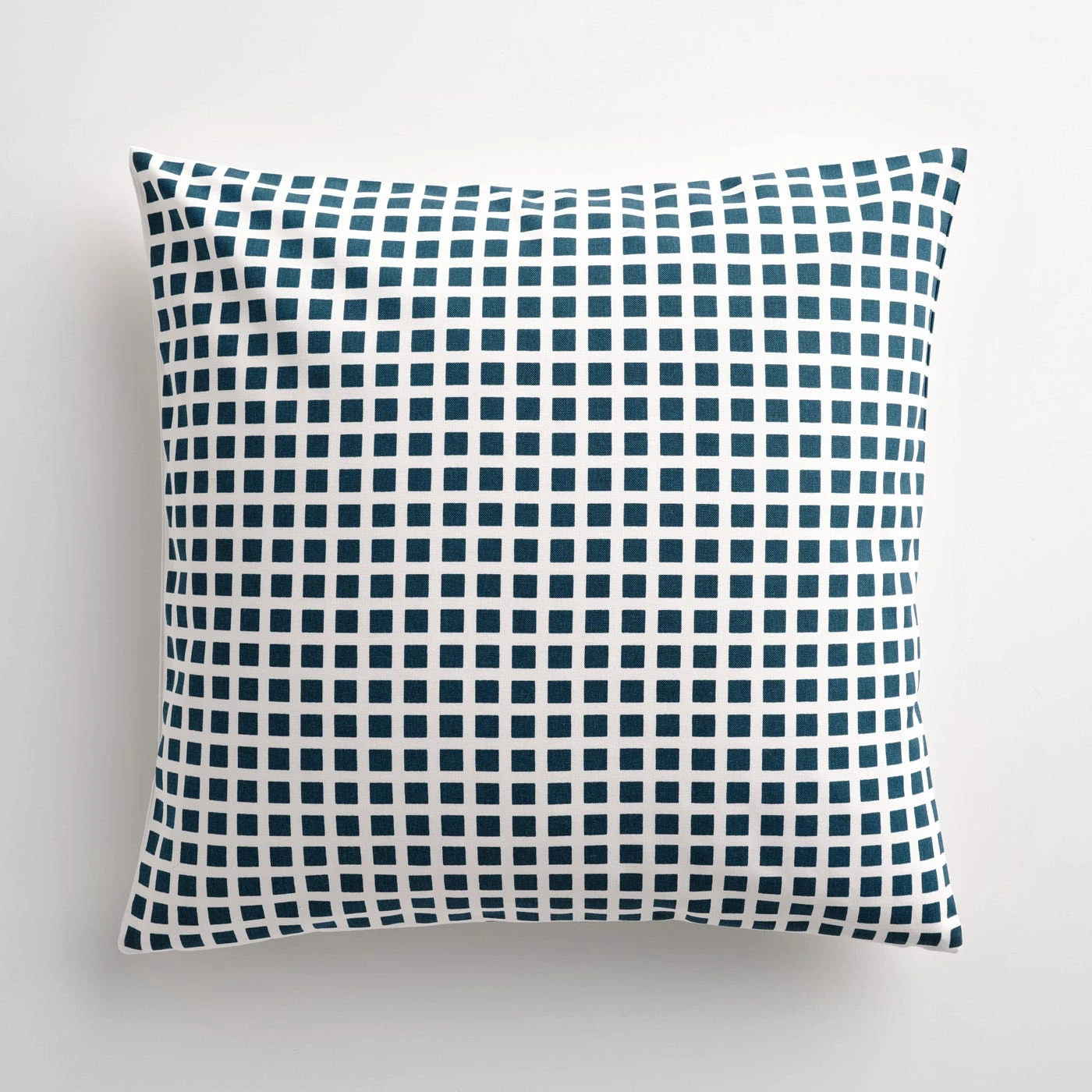 Add a statement piece on a sofa, chair or bed with the Tiles Lake Throw Pillow Cover. Its bold teal blue tone brings to mind the waters of a crystal-clear lake on a sunny day. This captivating color is beautifully contrasted with a cotton sailcloth background in the Unison-exclusive Tiles print, which features a crisp, structured array of squares. The extra-large decorative pillow cover’s material has a wonderful heft and durability while still being comfortable and inviting. The fabric is screen-printed by hand in a family-owned textile mill in operation since the 1930s, then cut and sewn locally in Chicago.