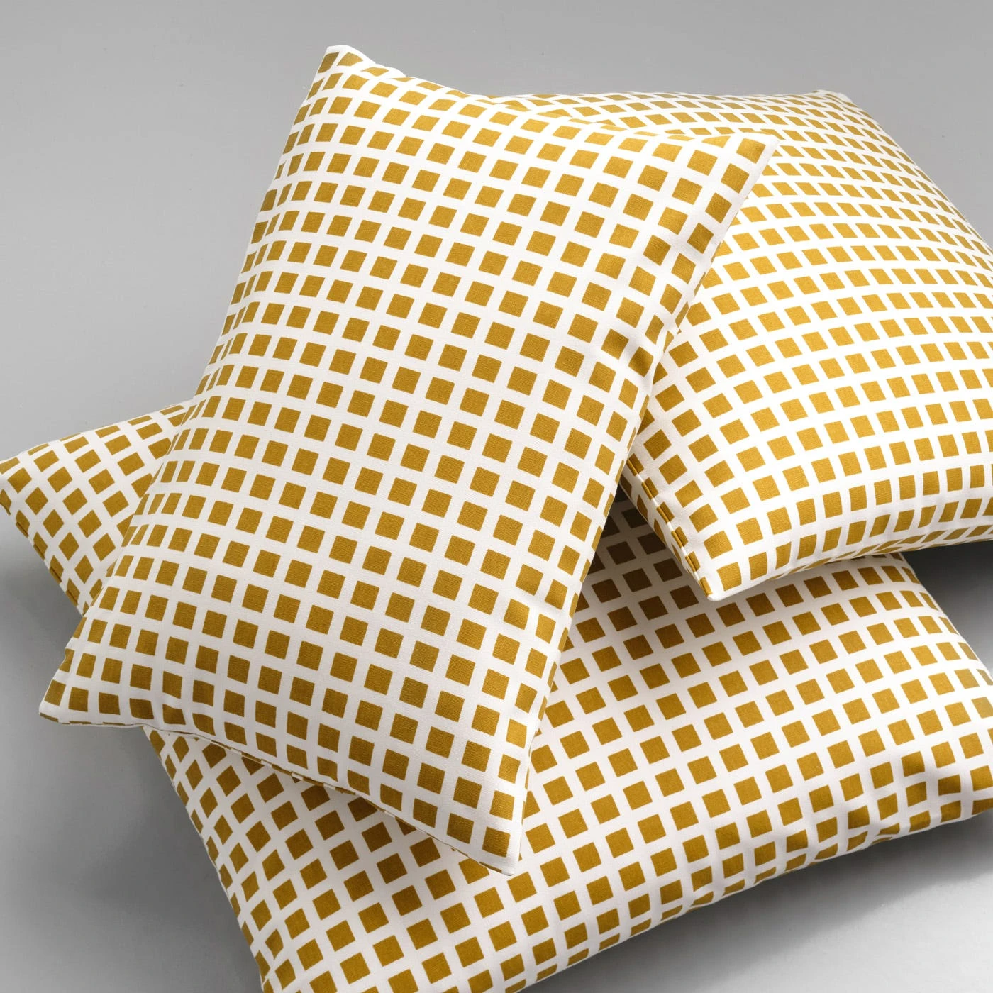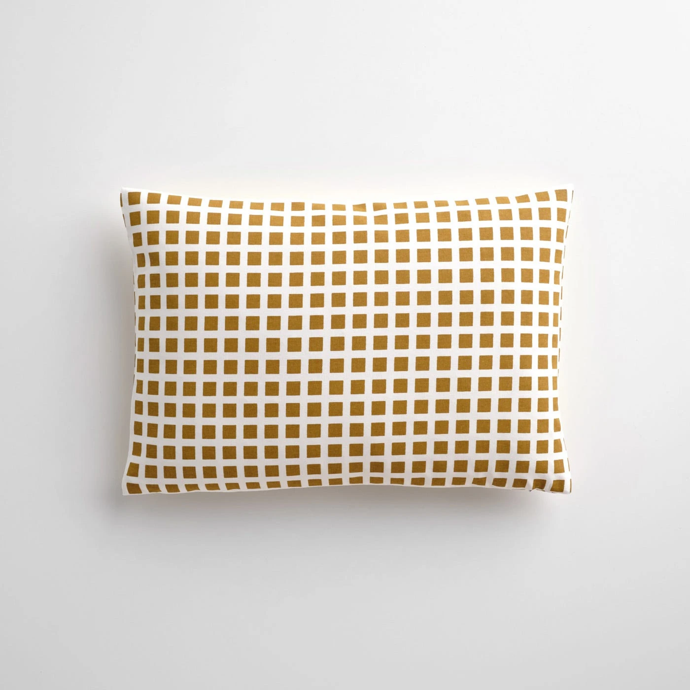 A simple geometric pattern combined with a captivating color makes the Tiles Yarrow Throw Pillow Cover a timeless decorative accent. This Unison-exclusive print features a grid of repeating squares set against a bright white cotton sailcloth background. Each of the squares is saturated with a deep golden yellow hue, adding a colorful accent to a sofa, chair or bed. The fabric is hand screen-printed by a family-owned textile mill which has been operating since 1937, one of the few remaining fabric mills of its kind in the U.S. A local sewing business then finishes each rectangular accent pillow cover with a hidden zipper.