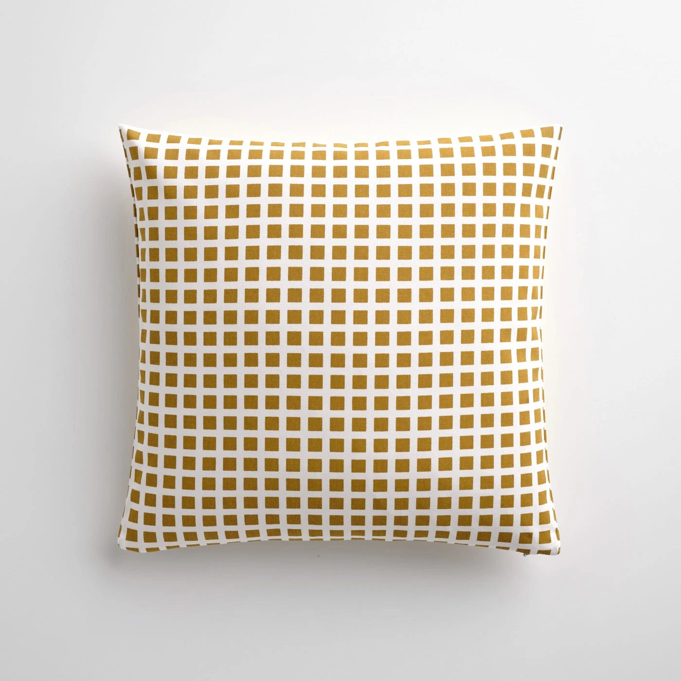 A simple geometric pattern combined with a captivating color makes the Tiles Yarrow Throw Pillow Cover a timeless decorative accent. This Unison-exclusive print features a grid of repeating squares set against a bright white cotton sailcloth background. Each of the squares is saturated with a deep golden yellow hue, adding a colorful accent to a sofa, chair or bed. The fabric is hand screen-printed by a family-owned textile mill which has been operating since 1937, one of the few remaining fabric mills of its kind in the U.S. A local sewing business then finishes each square accent pillow cover with a hidden zipper.