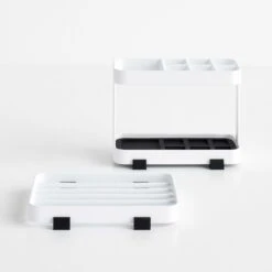 A step above your everyday soap dish, this thoughtful Japanese design provides more than a streamlined look. The slotted design allows water to drain, extending the life of your soap and keeping it cleaner, too. Effortlessly adaptable, you can also use the dish in the kitchen as a sponge holder. With rubber feet added for stability, this clean white tray complements any countertop.