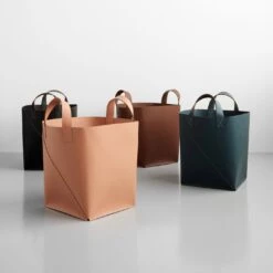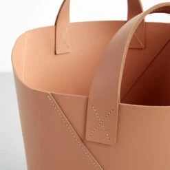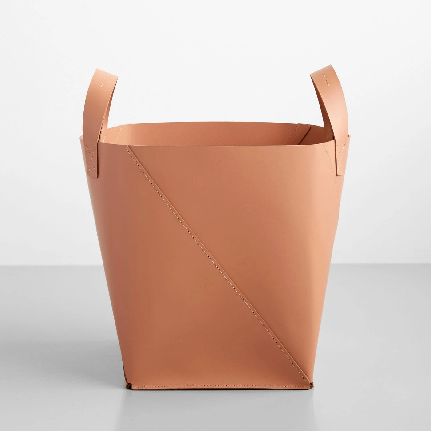 Feature a sustainable and portable storage option in your home with the Twist Clay Leather Floor Basket. Made in Spain with 100% recycled leather, the basket is crafted using discarded off-cuts which have been transformed into a new material that is just as soft and luxurious as conventional leather. The design features diagonal seams with contrasting stitching and thick, sturdy handles. The shape tapers down slightly from the top, creating a spacious opening for shoes, toys, towels, blankets or magazines. The tan leather basket adds a touch of welcoming warmth to living rooms, bedrooms and more.
