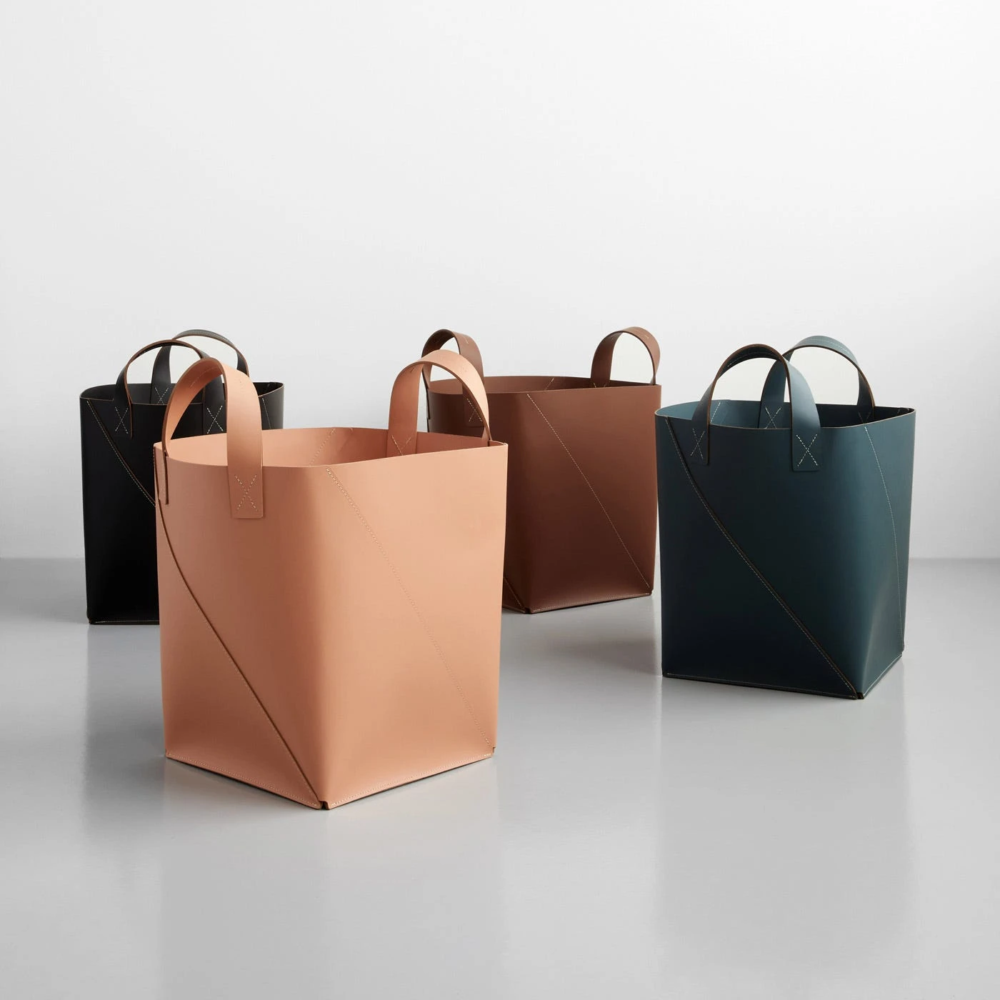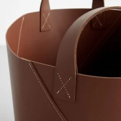 Feature a sustainable and portable storage option in your home with the Twist Pecan Leather Floor Basket. Made in Spain with 100% recycled leather, the basket is crafted using discarded off-cuts which have been transformed into a new material that is just as soft and luxurious as conventional leather. The design features diagonal seams with contrasting stitching and thick, sturdy handles. The shape tapers down slightly from the top, creating a spacious opening for shoes, toys, towels, blankets or magazines. The brown leather basket adds a sophisticated touch to any room in the home.