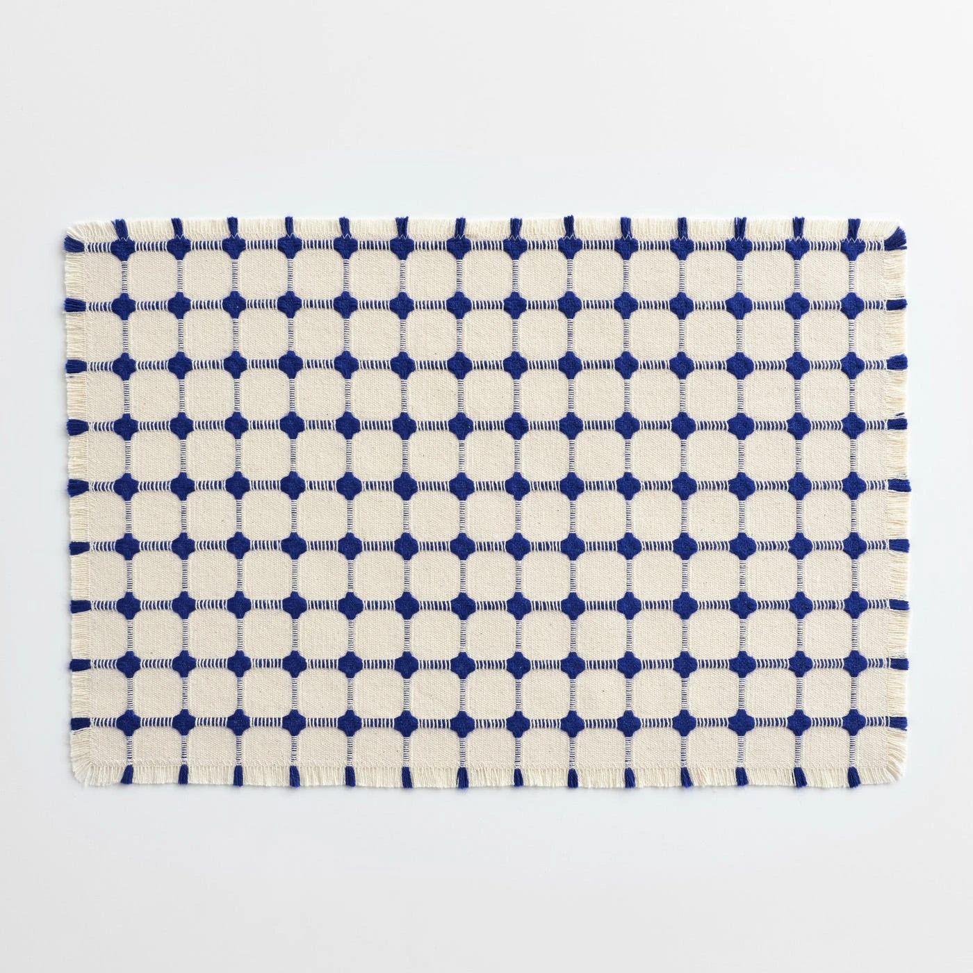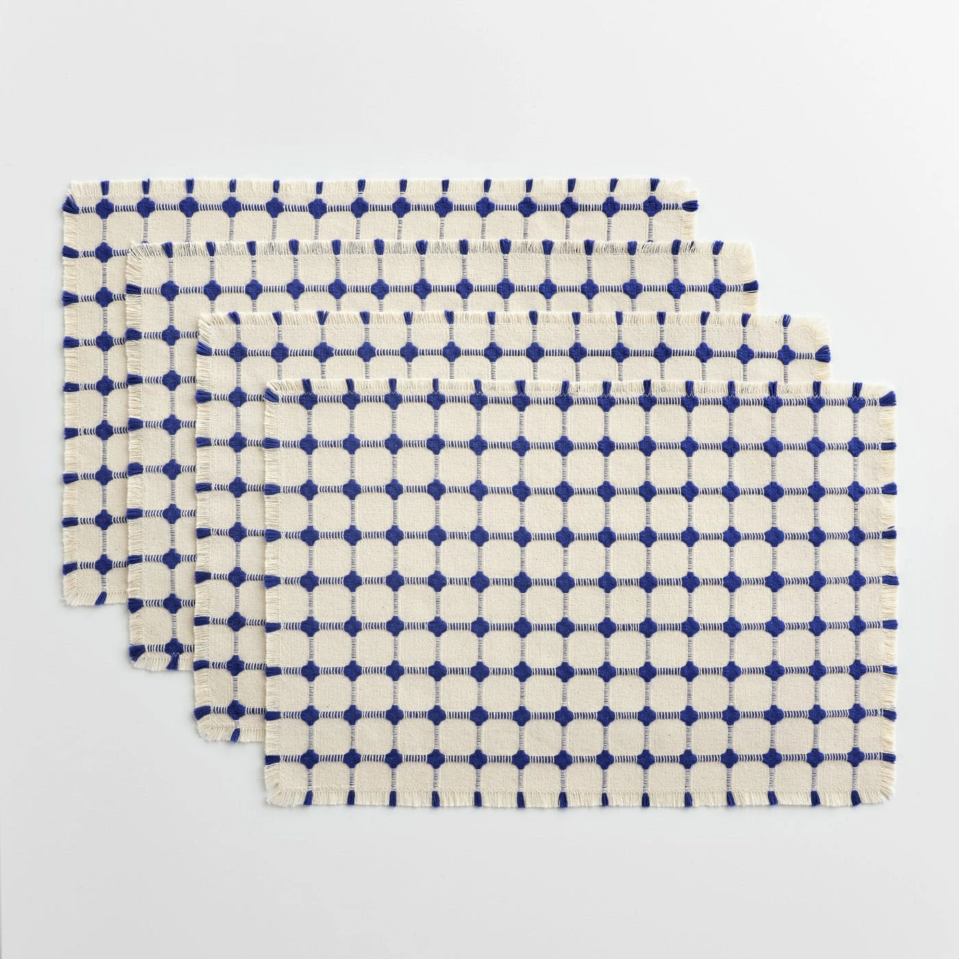 Add an accent of color to every meal with Wicker Cobalt Placemats. The set of four placemats feature rich blue threads woven into a natural cotton canvas using traditional Mexican hand-knotting techniques. The brightly colored yarns form a pattern similar to that of classic rattan cane weaving and extend into the shortly frayed ends. The thick, woven textures stand out on the substantial yet soft fabric, which will become more relaxed in look and feel over time. Pair these placemats with the Wicker Cobalt Napkins for a coordinated look.