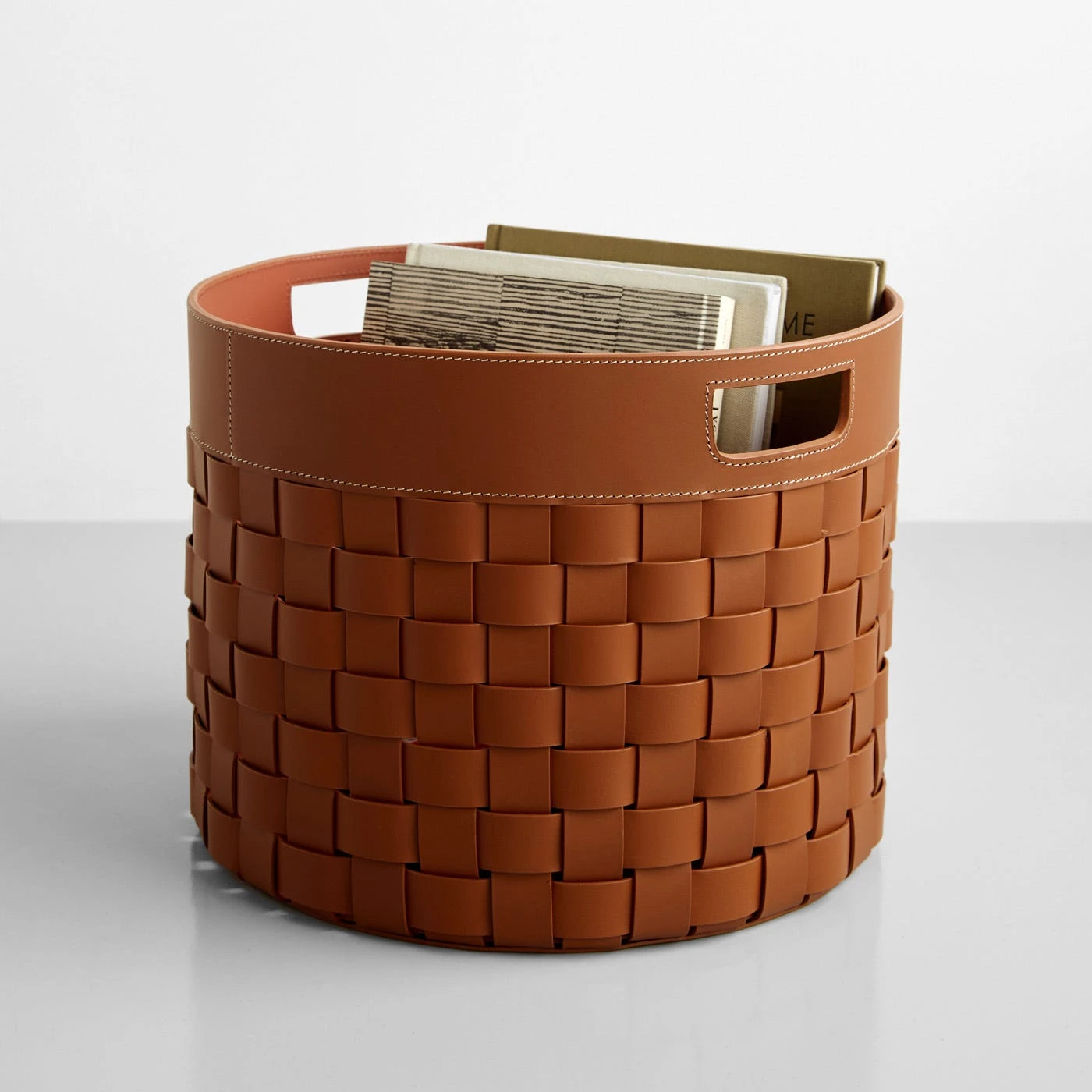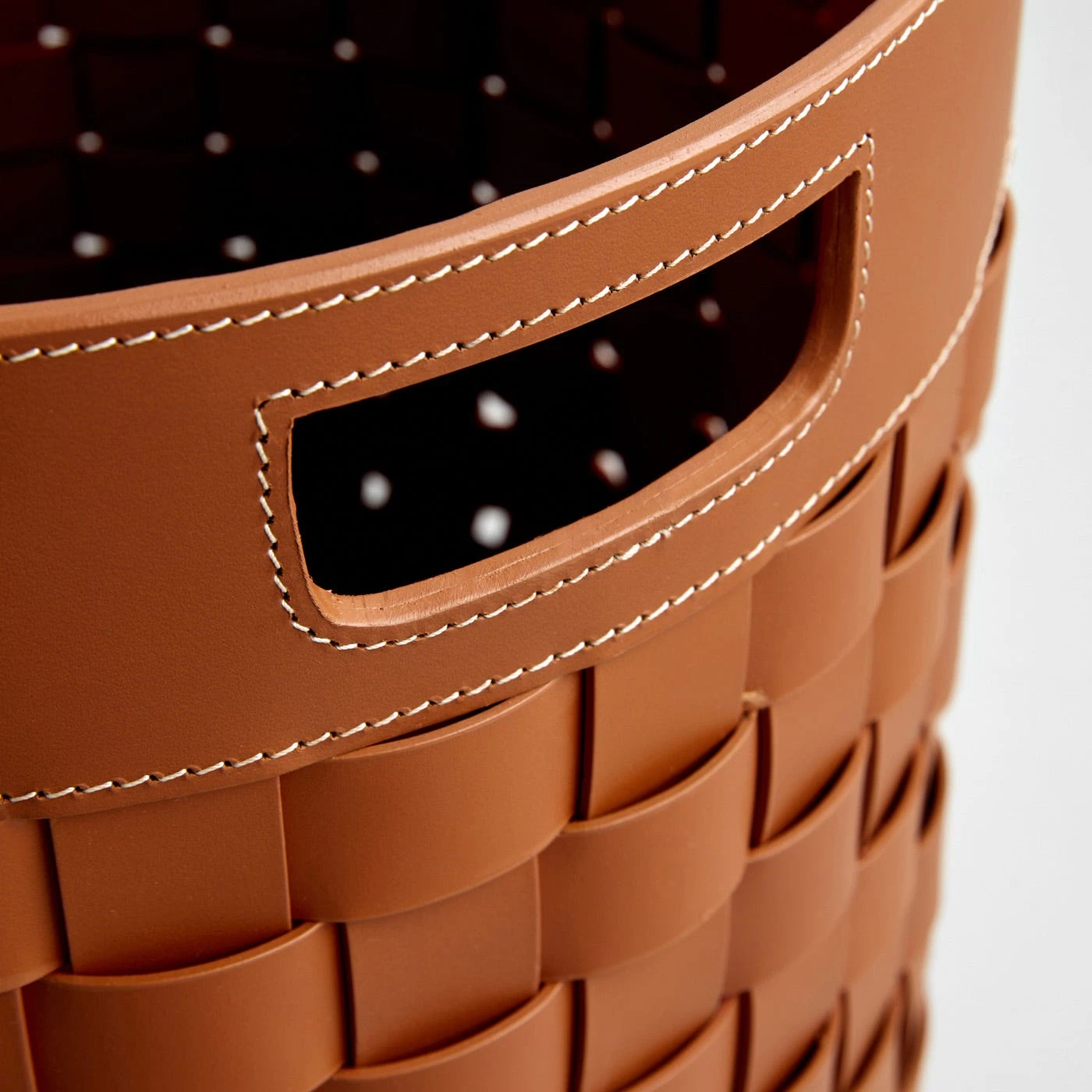 The Woven Leather Cognac Round Floor Basket offers a refined take on home storage. Thick woven strips of vegetable-dyed, recycled leather are accented by white stitching and cut-out handles to create a sophisticated version of the typical storage bin. This sustainable approach repurposes leather leftovers which would otherwise go to waste. A coating is applied to prevent dirt and grease from sticking to the surface and to ensure ease of maintenance. Place throw blankets or magazines inside for tidy organization. With its substantial, structured design, this sturdy brown leather basket can also accommodate heavier items like fireplace logs.