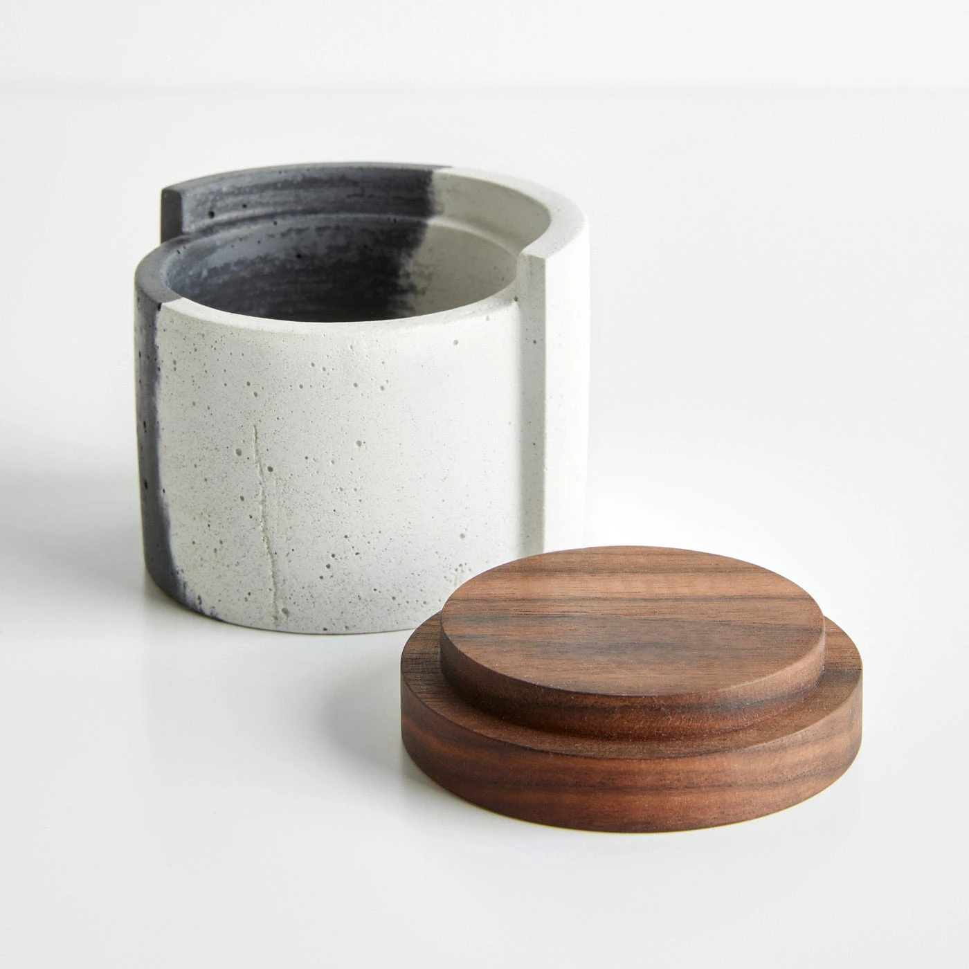 Convenience doesn’t have to be boring. This eye-catching piece is perfect for any room in the house. And don’t bother putting it away — as artistic as it is versatile, this piece is meant to be seen. Keep small items at your fingertips with this concrete container, perfect for use with sea salt, office supplies and more. This black and white dual-colored vessel features a beautiful walnut lid to stash your necessities out of view. Since this item is food safe, you can store your spices close at hand with this black and white layered container.